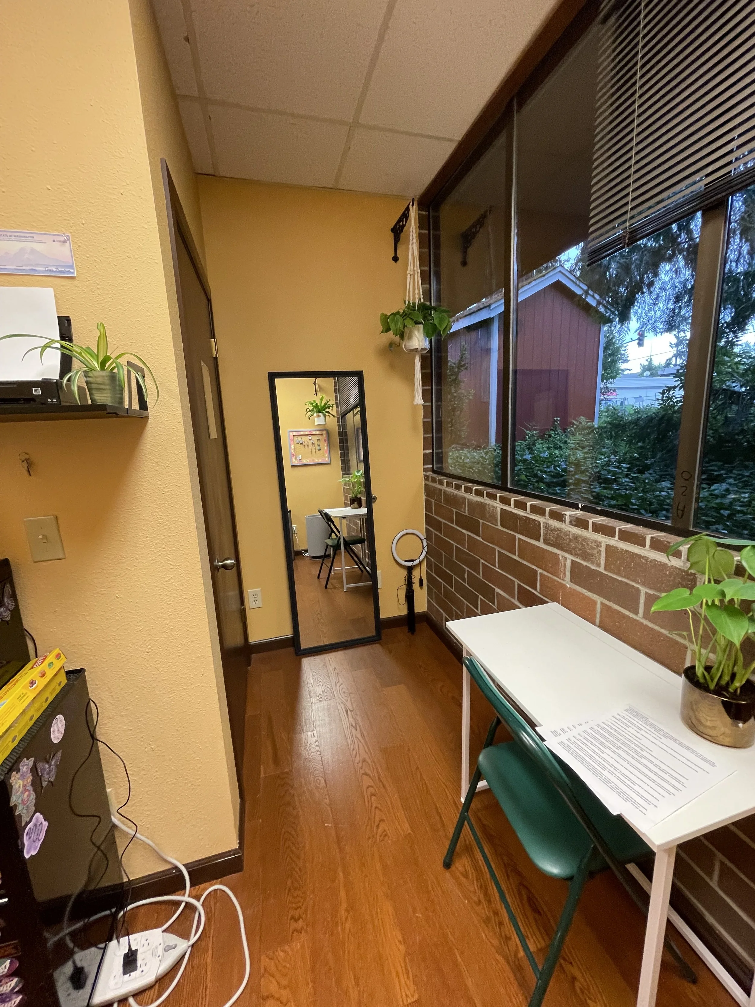 I work in my private studio in Lacey called Sweet Tooth Tattoo. It is very small and has large windows facing a tree. There are no stairs to enter my studio, just a ramp and a hallway.